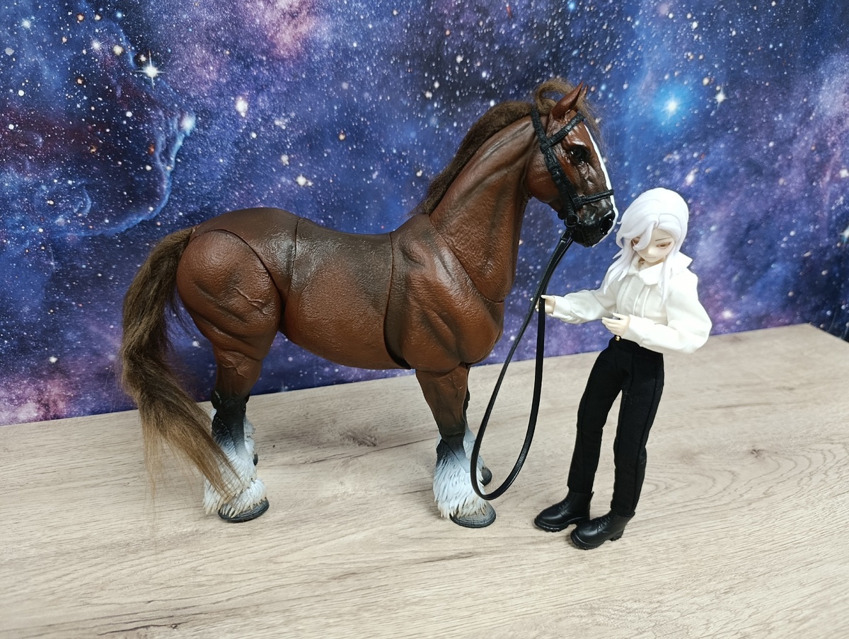 Подвижные кони редкость, а учитывая, что я последнее время играюсь в основном "сицилийскими псами", которые чуть крупнее 1:12, я решила поселить у себя нового коня от Fish Toys. К тому же коней 1:6 от MrZ z давно продала. Приехал конь довольно быстро и был упакован в картонную коробку со вставкой из плотного параллона. Обмундирование литое, надето было сразу на коня. Сам конь выполнен из прочного пвх, за исключением почему-то шеи. Шея покрыта более мягкой резиной. Уздечка тоже из мягкой резины. Седло со всей комплектацией из прочного пвх. Подвижность коня весьма условная. Лучше всего двигается голова. Сесть или лечь он не сможет, не хватает хода шарниров. Из-за щеток не хватает так же хода шарниров, чтобы поставить его на дыбы. Но он и не держит равновесие в этой позе, нужна подпорка. Но я не удердалась и заказала сразу еще и белого себе. На этот раз без мохнушек на ногах.