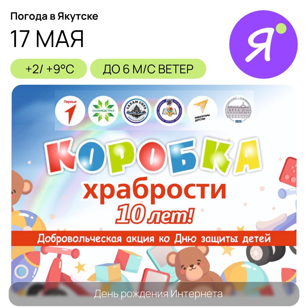 Доброе субботнее утро 🤩 С 14 по 27 мая Национальная библиотека РС(Я) присоединяется к республиканской акции, организованной СК «Сахамедстрах» и добровольческой организацией «Сахам Сирэ», приуроченной ко Дню защиты детей. После сложной медицинской процедуры ребёнок может выбрать из «Коробки храбрости» небольшой подарок - игрушку, книгу, раскраску или набор для творчества. Это помогает детям легче переносить стресс и боль. Что можно принести? 🤩 Новые игрушки (машинки, куклы и др.) 🤩 Раскраски и детские книги 🤩 Наборы для творчества 🤩 Карандаши, фломастеры, канцтовары 🤩Все подарки должны быть новыми и в упаковке (санитарные требования). Мягкие игрушки не принимаются. 🤩Пункты сбора: Национальная библиотека РС(Я) - пр. Ленина, 40 (2 этаж, фойе). ДТК - Центр чтения - пр. Ленина, 1 (3 этаж). 1 июня все собранные подарки передадут в детские отделения больниц Якутии. Online Якутия | Подписаться