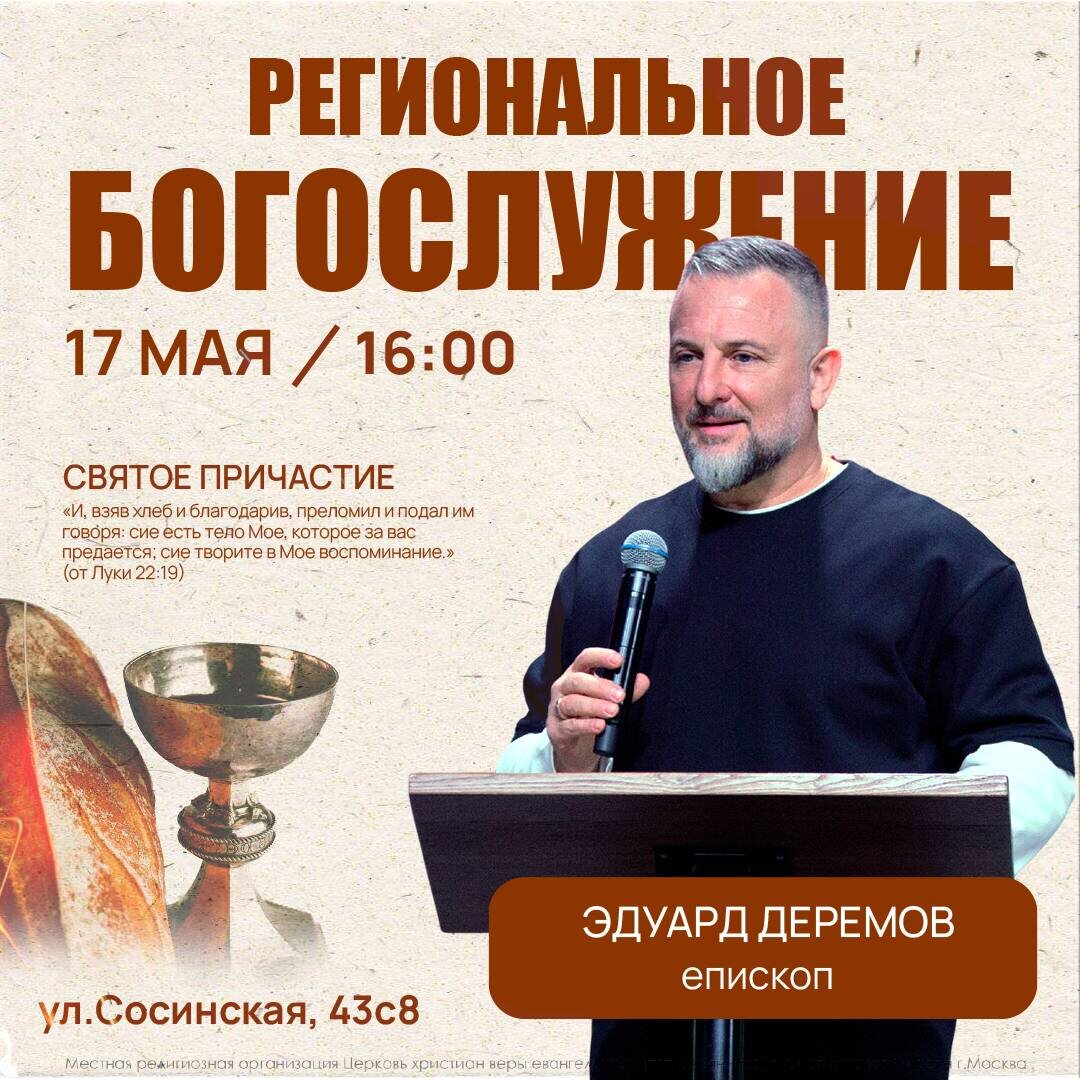 17 мая / 16:00 / Сосинская 43с8, м.Волгорадский проспект Мы приглашаем вас, чтобы вместе услышать послание изменяющее жизнь, от епископа Эдуарда Деремова, совершить таинство Святого Причастия и вместе провести это время! Для тех, кто не сможет быть в этот день в церкви, онлайн: https://chm12.ru/live До встречи в церкви! 🙏
