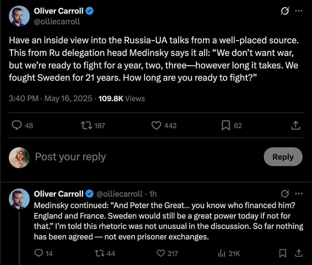 "Он заявил украинцам: "Мы не хотим войны, но мы готовы сражаться год, два, три — сколько бы времени это ни заняло. Мы воевали со Швецией 21 год. Как долго вы готовы сражаться?", — опубликовал пост Кэрролл ссылаясь на хорошо информированного источника.
