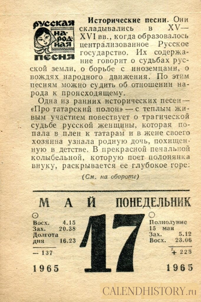 Итак, сегодня 17-го мая и у нас на календаре 1965-й год. Перед нами листок советского календаря для женщин. На календаре у нас понедельник - 17 мая 1965-го года. РУССКАЯ НАРОДНАЯ ПЕСНЯ Исторические песни. Они складывались в XV—XVI вв., когда образовалось централизованное Русское государство. Их содержание говорит о судьбах русской земли, о борьбе с иноземцами, о вождях народного движения. По этим песням можно судить об отношении народа к происходящему. Одна из ранних исторических песен — «Про татарский полон» — с теплым живым участием повествует о трагической судьбе русской женщины, которая попала в плен к татарам и в жене своего хозяина узнала родную дочь, похищенную в детстве. В прекрасной печальной колыбельной, которую поет полонянка внуку, раскрывается ее глубокое горе: (См. на обороте) *** Оборотную сторону листка этого календаря можно посмотреть у нас по ссылке на сайте. Заходите на наш интересный сайт об отрывных календарях. Другие листки советских календарей смотрите у нас на с