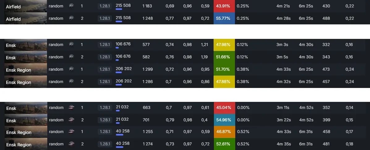 Опять же держим в голове, что это фактически новая карта для игроков. «Энский регион» в стандартном бою имеет средние показатели и находится примерно в середине по всем нашим отслеживаемым показателям. Но если сравнивать с обычным Энском, то среднее время здесь выросло ровно на 2 мин. (играют только 8-10 лвл)