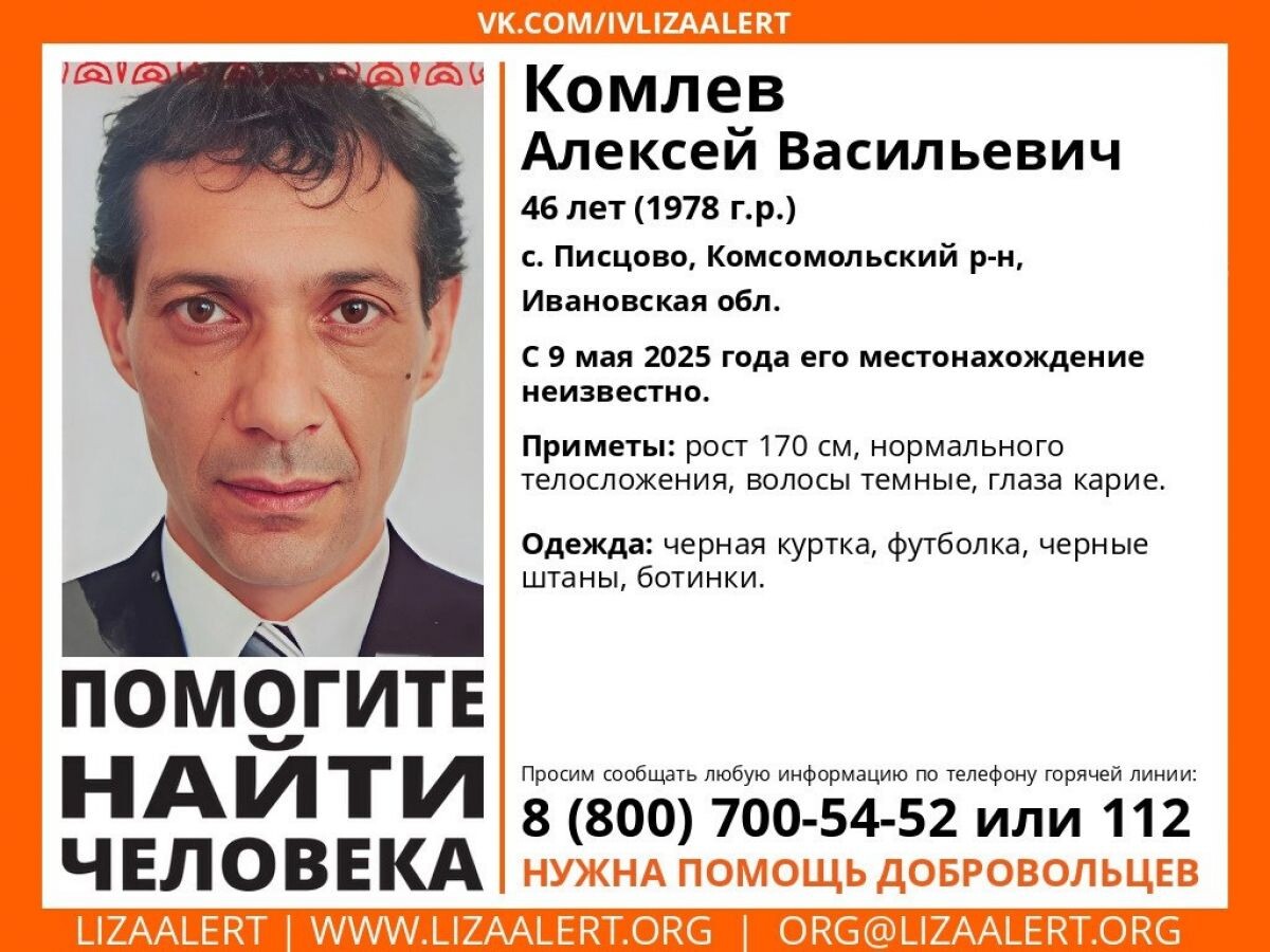В Комсомольском районе Ивановской области разыскивают 46-летнего Алексея Комлева из села Писцово. Мужчина перестал выходить на связь 9 мая 2025 года, его местонахождение до сих пор неизвестно. Приметы: Любая информация может помочь в поисках! Если вы видели Алексея или знаете что-то о его возможном местонахождении, срочно сообщите по телефонам: Распространите эту информацию — возможно, именно ваш репост спасет жизнь!