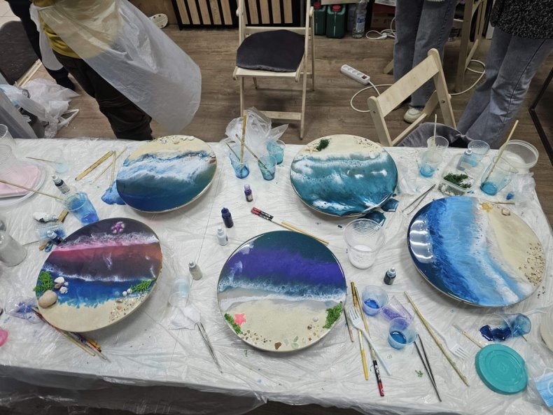 Прекрасные моря из эпоксидной смолы я уже давно присмотрела. Хотелось сделать и своё. Я ведь не понимала, каким оно будет, и мне кажется, что приходит это только в процессе, а вот что оно отражает? Что-то точно, возможно, характер, душу, видение мира или всё вместе взятое. Наши с дочкой определенно получились необычными.У каждого своё море Наконец выдалась возможность посетить мастер-класс, так ещё и вместе с дочкой! Роскошный семейный вечер, скажу я вам. Кстати, Художественная студия PlaMiArt - это тоже семейное дело! Учили нас творить моря мама и сын - Валерия и Михаил:). С ними комфортно, уютно и позитивно. Сначала я зарядилась на творческий процесс чаем с печенькой, потом мы завязали волосы, надели фартуки и масочки и приступили к работе. Начинать страшно! Когда считаешь себя криворуком и не веришь, что получится красиво. Наши учителя нас заверили, что будет точно классно, и мы им поверили.)) Так и вышло! У всех получилось по-своему красиво, интересно, завораживающе. Я постоянно пе