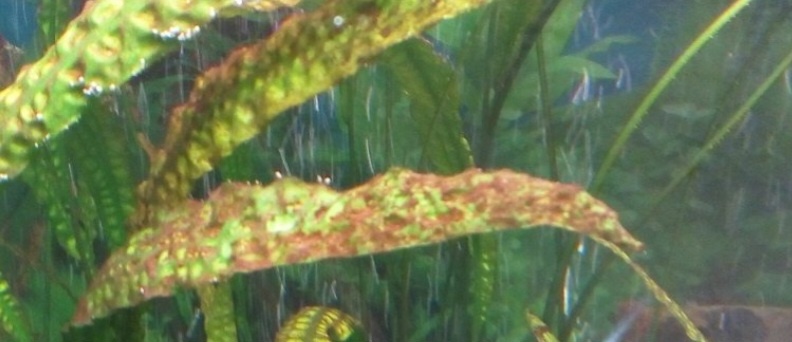## Диатомовые водоросли в аквариуме ### Описание и характеристики **Диатомовые водоросли** представляют собой скользкий коричневый налёт или тонкие бурые нити, которые покрывают все поверхности в аквариуме: стёкла, грунт, декорации и растения. Они особенно активно развиваются в затенённых аквариумах и являются частым явлением в молодых аквариумах. ### Причины появления **Основные факторы**, способствующие развитию диатомовых водорослей: * **Недостаточное освещение** (менее 0,5 Вт/л) * **Неправильный спектр** освещения (отсутствие красного и синего света) * **Высокая концентрация** нитратов в воде * **Повышенный pH** (более 7,5) * **Низкий уровень** углекислого газа * **Избыток силикатов** в водопроводной воде * **Перекорм рыб** * **Нестабильный азотный цикл** в новом аквариуме ### Методы борьбы **Эффективные способы** устранения диатомовых водорослей: * Механическое удаление налёта с поверхностей * Обеспечение правильного освещения (не менее 0,5 Вт/л) * Установка ламп с красным и