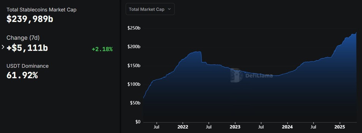 💰 The total market cap of stablecoins is nearing a new all-time high at $240 billion! 🚀 In just the past week, issuers have dropped over $5 billion into the market. Talk about a stable surge! #CryptoNews #Stablecoins