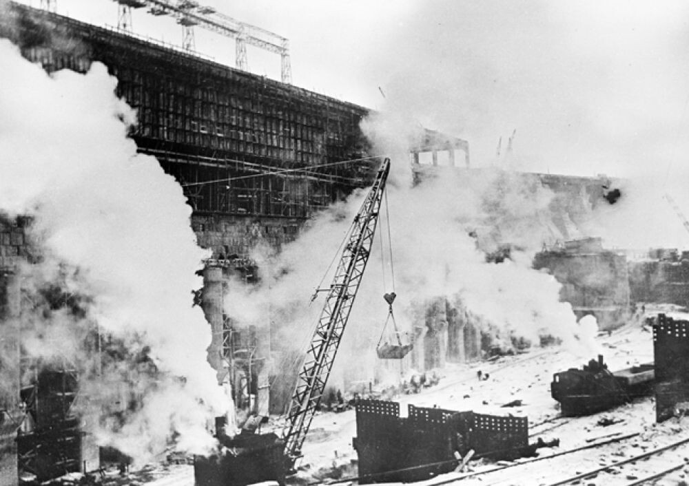 Строительство Днепровской гидроэлектростанции (ДнепроГЭС) стало не только техническим, но и культурным символом эпохи ГОЭЛРО. Этот проект был воплощением мечты о новой, индустриальной стране, где энергия становится двигателем прогресса и благополучия. ДнепроГЭС была заложена в 1927 году на Днепре, в районе Запорожья. В воспоминаниях главного инженера проекта И. Г. Александрова говорится: «Мы понимали, что строим не просто станцию, а новый центр притяжения для всего юга страны». Строительство шло в рекордные сроки: в 1932 году станция дала первый ток, а её мощность - 560 МВт - сделала её крупнейшей гидроэлектростанцией Европы. Строительство Днепровской гидроэлектростанции, 1931 год. Проект требовал не только огромных ресурсов, но и новых технологий. Впервые в СССР были применены методы крупноблочного бетонирования, а турбины проектировались с учётом особенностей Днепра. К работам привлекались иностранные специалисты: американская фирма Cooper Engineering консультировала по вопросам обор