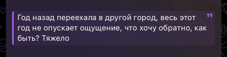 Пятничные ответы… Есть люди, которым сложно даются перемены, особенно если в новом нет поддержки, нет друзей и единомышленников. Здесь важно понять, что именно тянет назад. Вы хотите к определенным людям? Или может быть к ощущению причастности к чему-то бОльшему, чем здесь? Или возможно вы скучаете по родным? А может быть что-то ещё. Посмотрите, что за чувство вас держит. К кому это чувство? Как вы можете это дать себе здесь? Если можете? Найдите то, что вас начнёт «зажигать» в новом месте. Найдите единомышленников. Найдите поддержку для себя. И если ничего не помогает, тогда вопрос другой? А что заставило вас переехать? Вы пытаетесь убежать от чего то? Тогда разобраться в тех взаимоотношениях с кем-то или чём-то и перестать бегать. Ну а от себя точно не сбежать, в любом случае придётся разбираться с собой.