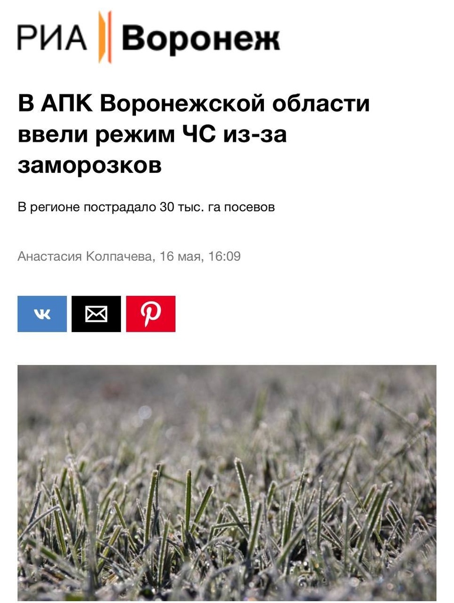 В ответ на пост 🔥 Власти Воронежской области ввели режим ЧС в сельском хозяйстве из-за аномальных заморозков В Воронежской области ввели режим чрезвычайной ситуации в сельском хозяйстве из-за ущерба, причинённого прошедшими заморозками, говорится в указе губернатора, опубликованном на сайте регионального правительства. Главам муниципалитетов рекомендовано до 30 мая направить данные о размере ущерба в региональный Минсельхоз. Заморозки были зафиксированы на всей территории региона 27, 28, 29 апреля и 3 мая. Температура воздуха и почвы местами опускалась до минус 8-10 градусов. По предварительным данным, пострадало более 30 тысяч гектаров посевов. Были повреждены более 2,6 тысячи гектаров садов и ягодников, что составляет 44% всех плодоносящих насаждений области. По прогнозам, урожай фруктов и ягод в этом году будет в два раза ниже ранее ожидаемого. Майские заморозки затронули и другие регионы России, привели там также к гибели посевов и урожая сельскохозяйственных культур и нанесл