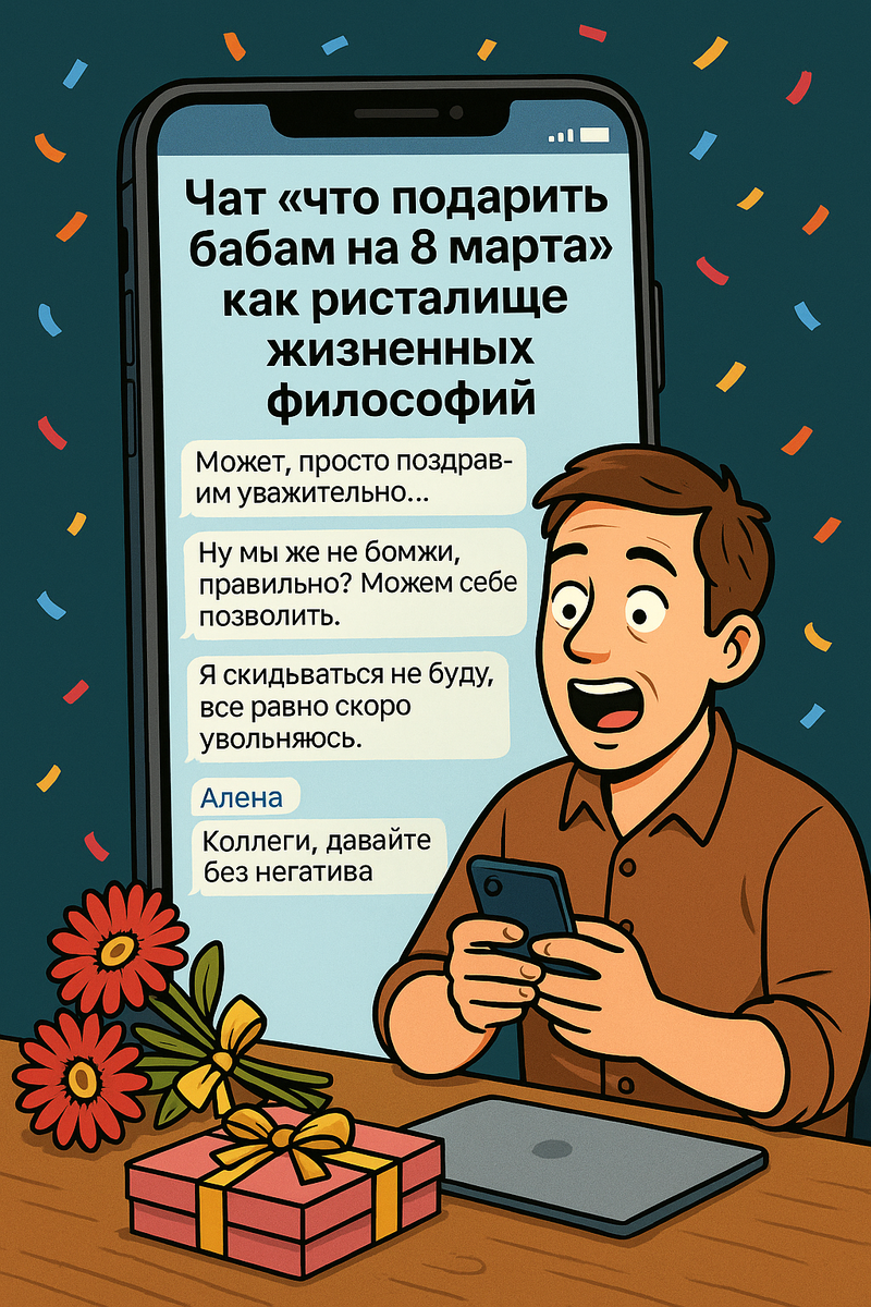 #юмор #офис #8марта #корпоратив #сторителлинг #ирония #HR #работа #офисныелюди #жизньвчате #мужскойчат #больиподарки #философиявповседневности #смешноибольно #подарки #жизньвтаблице #коробкасцветами #каквсегда