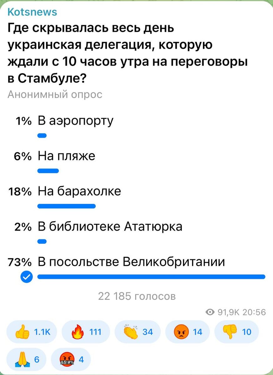 ⚡️⚡️⚡️ 73 процента проголосовавших считают, что украинская делегация пряталась в британском посольстве. Получала последние инструкции от кураторов.