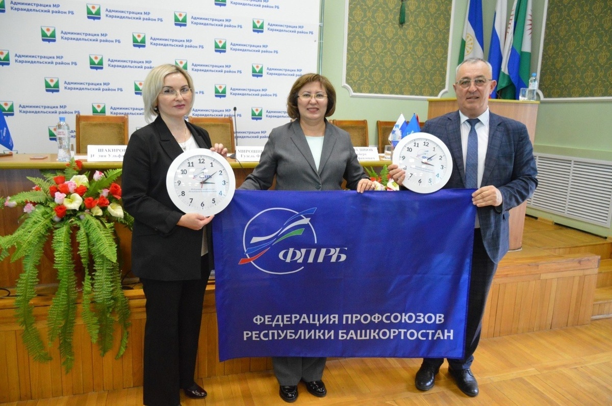 Председатель Федерации профсоюзов Республики Башкортостан Гузель Мирошниченко поздравила профсоюзный актив трудовых коллективов района и вручила дипломы, почетные грамоты, а также настенные часы с профсоюзной эмблемой .