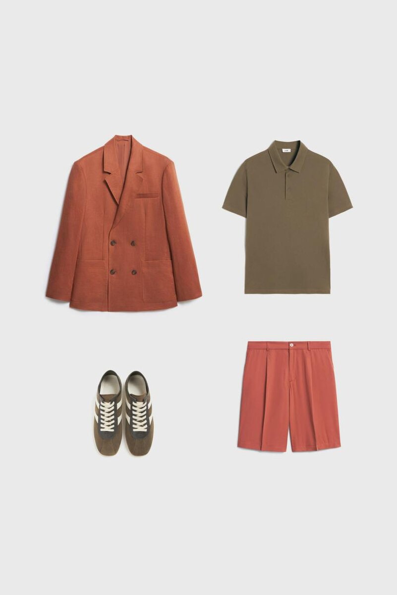 Идея модного сочетания оттенков для летних образов от стилистов LIMÉ: терракотовый + хаки. Образ 1: блейзер, брюки и рубашка изо льна, кожаные сабо и плетеный ремень; Образ 2: хлопковое поло, шорты с защипами из лиоцелла и льна, двубортный блейзер прямого кроя и кеды из замши с кожаными вставками; Образ 3: рубашка из лиоцелла и льна, льняные брюки на эластичном поясе, сандалии с широкими ремешками и массивными металлическими пряжками и плетеный ремень из кожи; Образ 4: хлопковые рубашка оверсайз и широкие шорты с защипами, базовая футболка, высокие носки и замшевые кеды. #lime_match