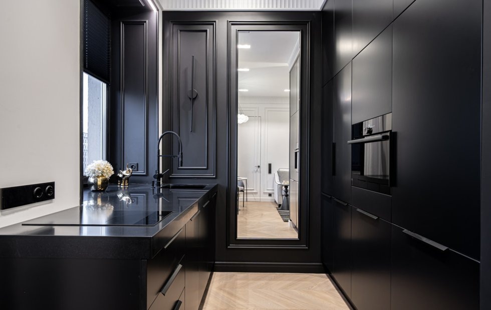 Дизайнеры Константин Голдберг и Анна Голдина создали ахроматичный стильный интерьер, в котором максимум света и воздуха Место: Москва Тип дома: Сталинка Метраж: 45 кв. м Комнаты: 2 Cанузлы: 1 Высота потолков: 3,2 м Дизайн: Константин Голдберг, Анна Голдина Анна Голдина и Константин Голдберг спроектировали эффектный ахроматичный интерьер в старом фонде в Хамовниках. Они снесли все стены и узаконили новую планировку. Для оформления была использована черно-белая цветовая палитра, которая создает элегантный и сдержанный интерьер. Стиль неоклассики привносит изысканность и утонченность, гармонично объединяя современные элементы с классической эстетикой. Изначально это была стандартная двушка с небольшими комнатами и маленькой кухней. В результате перепланировки кухню объединили с гостиной и отказались от газа, чтобы убрать дверь между этими зонами. Также обустроили отдельную спальню, выделив в ней место для гардеробной, и совмещенный санузел. Ремонт был выполнен капитальный, с заменой всех