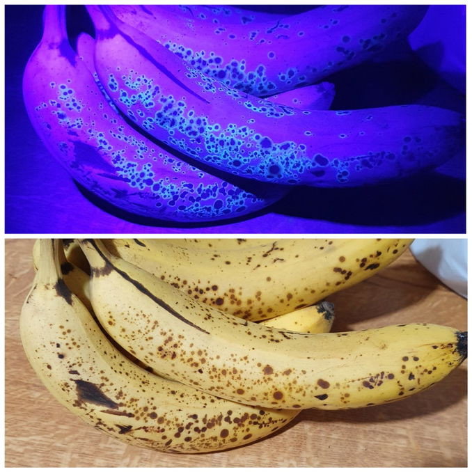 Когда банан зреет, в нём разрушается хлорофилл — тот самый зелёный пигмент, который когда-то был в кожуре, когда она ещё была зелёной. Но распадается он не полностью. В процессе остаются особые молекулы — флуорофоры, которые начинают светиться синим под ультрафиолетом. Это не просто оптический эффект — это биологически значимая реакция. Учёные предполагают, что таким образом плоды «общаются» с животными: сигнализируют, что они спелые и готовы к уп