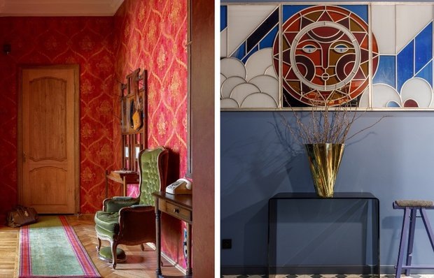 В московской квартире с типичной сталинской планировкой дизайнер Алена Сковородникова создала театральный интерьер. Перед ней стояла задача сохранить ощущение «пожившего пространства», не превращая квартиру в безжизненный новодел. Особенно выразительно это удалось реализовать в прихожей: длинный коридор оклеили бордовыми обоями с золотистыми вензелями, вдохновленными эстетикой позднего СССР.