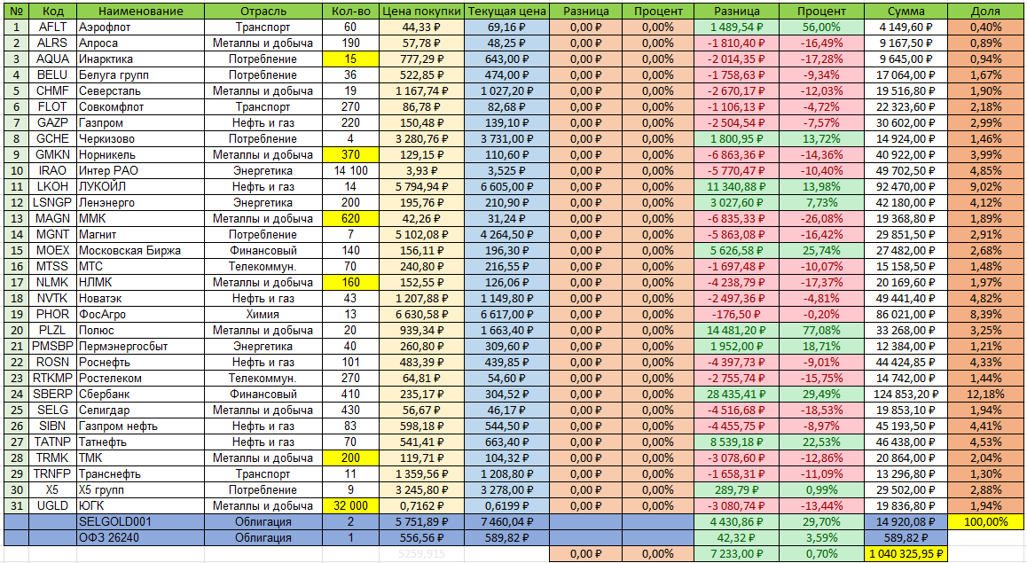 Приветствую вас на моем канале. Неделя была интересная. Я следил за первыми за три года переговорами России и Украины. Все эксперты твердили, что ни о чем не договорятся. Но я считаю, что сам факт начала переговоров, это уже хороший сигнал. Понятное дело, что такой конфликт за один день не разрулить. Но начало положено. И я надеюсь, все постепенно будет двигаться к миру. Скептики со мной не согласятся. Ну а мне и не важно. Мои мысли, это мои мысли. Ну а теперь перейдем к обзору моего скромного портфеля. Вот так он сейчас выглядит. Желтым отмечены покупки этой недели. В основном это были металлурги, и один заводчик рыбы затесался. Сектор металлов и добычи сейчас переживает не лучшие времена. Но, я считаю, что именно в такие времена и нужно набирать свою позицию в этих бумагах. Что я и делаю. Посмотрим, как сейчас выглядит соотношение долей по секторам. Все еще лидером остается сектор металлов и добычи. Но просадка уже не такая большая, как была неделю назад. В пятницу даже финансовый се