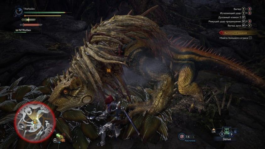 Оружия в игре очень много, и оно очень разное. Парные клинки бьют быстро, но имеют малую дальность. Атаки длинной катаной роняют ее на врага впереди или делают выпады, а для тяжелого горизонтального замаха надо тратить полоску концентрации. У каждого типа оружия свой разнообразный мувсет, который стоит разучить. Ударов не так много, но гораздо больше, чем в Dark Souls. В DS полагаешься только на череду легких атак, потому что сильные и особые используются в специфические моменты. В MonHun чувствую легкое нутро слэшера, хотя с этим жанром я знаком поверхностно. Схожесть чувствуется в том числе из-за нетрадиционной раскладки геймпада: кнопка X использует расходники, а легкие атаки используют Y