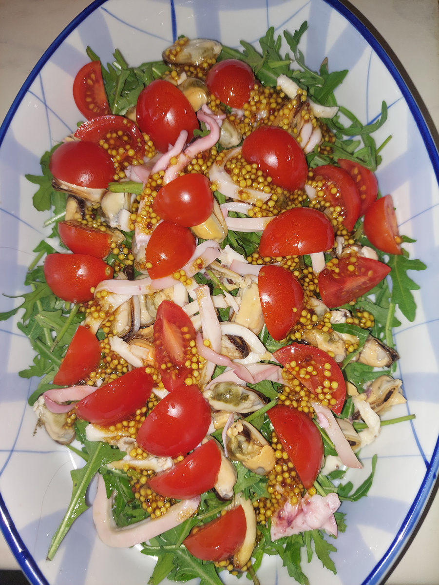 Когда нет времени готовить, а нужен эффектный и вкусный салат, то этот салат всегда придёт Вам на помощь. Берём обязательно ассорти морепродуктов в масле, не в рассоле. Руккола продаётся в магазинах круглогодично, она будет нижним слоем подушкой. Сверху кладём резанные черри. Затем морепродукты (у меня мидии, кальмары осьминог). Чуть добавляем масла из них, оно у нас будет вместо заливки.Сверху зерновая горчица. Можно все присыпать тёртым сыром. А можно без сыра.