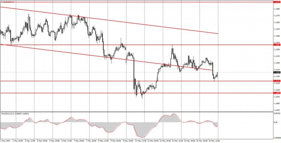 https://basechop.ru/wordpress/?p=43049 Разбор сделок пятницы: 1Н график пары EUR/USD. Валютная пара EUR/USD в пятницу довольно сильно просела в цене, хотя макроэкономических и фундаментальных оснований для этого не было никаких. Однако нисходящий тренд на часовом ТФ сохраняется, и он обусловлен снижением торговой напряженности в мире, о чем мы уже говорили ранее. Да, доллар не готов дорожать теми же темпами, какими он падал в течение последних 3 месяцев, но все же нельзя отрицать снижение пошлин, переговорные процессы между США и другими странами. Поэтому доллар имеет все шансы на рост в ближайшее время. Мы бы хотели еще отметить «ястребиную» позицию ФРС и «голубиную» ЕЦБ, но этот фактор по-прежнему никакого влияния на настроение рынка не оказывает. В пятницу все три отчета, которые можно считать более или менее важными, оказались слабее прогнозов. Три отчета из США… Таким образом, рост американской валюты никоим образом не был связан с этими публикациями. 5M график пары EUR/USD. Н