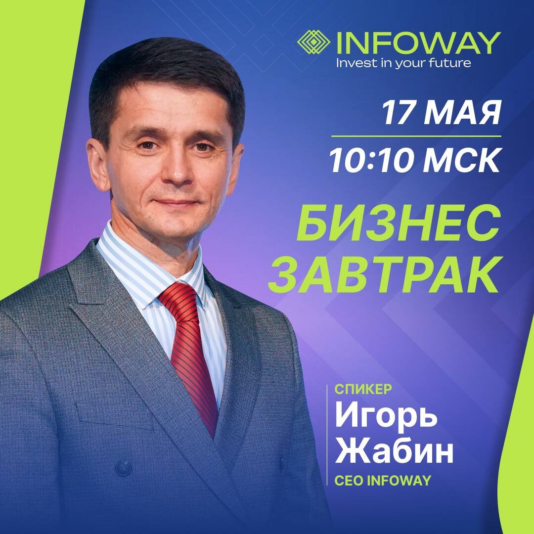 🗞️☀️Суббота может быть ещё интереснее, если с утра пойти на бизнес-завтрак! 17 мая, в 10:10 по МСК! Приглашаем вас на бизнес-завтрак с CEO INFOWAY Игорем Жабиным! 🆕 ✨О спикере: • Опыт работы в сфере мультиуровневого маркетинга - более 20 лет • Входит в Топ 200 мирового рейтинга Business for Home • Создатель международного проекта "Инвестиционно Страховой Институт" • Обладатель трех МЛМ Оскаров • Автор книги: "Игры, в которые играют Деньги" • Организатор общесетевых мероприятий "Ассамблея сетевых мероприятий" (стадион "Лужники", "Крокус - Сити Холл) Не упустите возможность поговорить с директором компании в формате бизнес-завтрака! 🚀 ПРИСОЕДИНЯЙТЕСЬ! 10:10 по МСК!