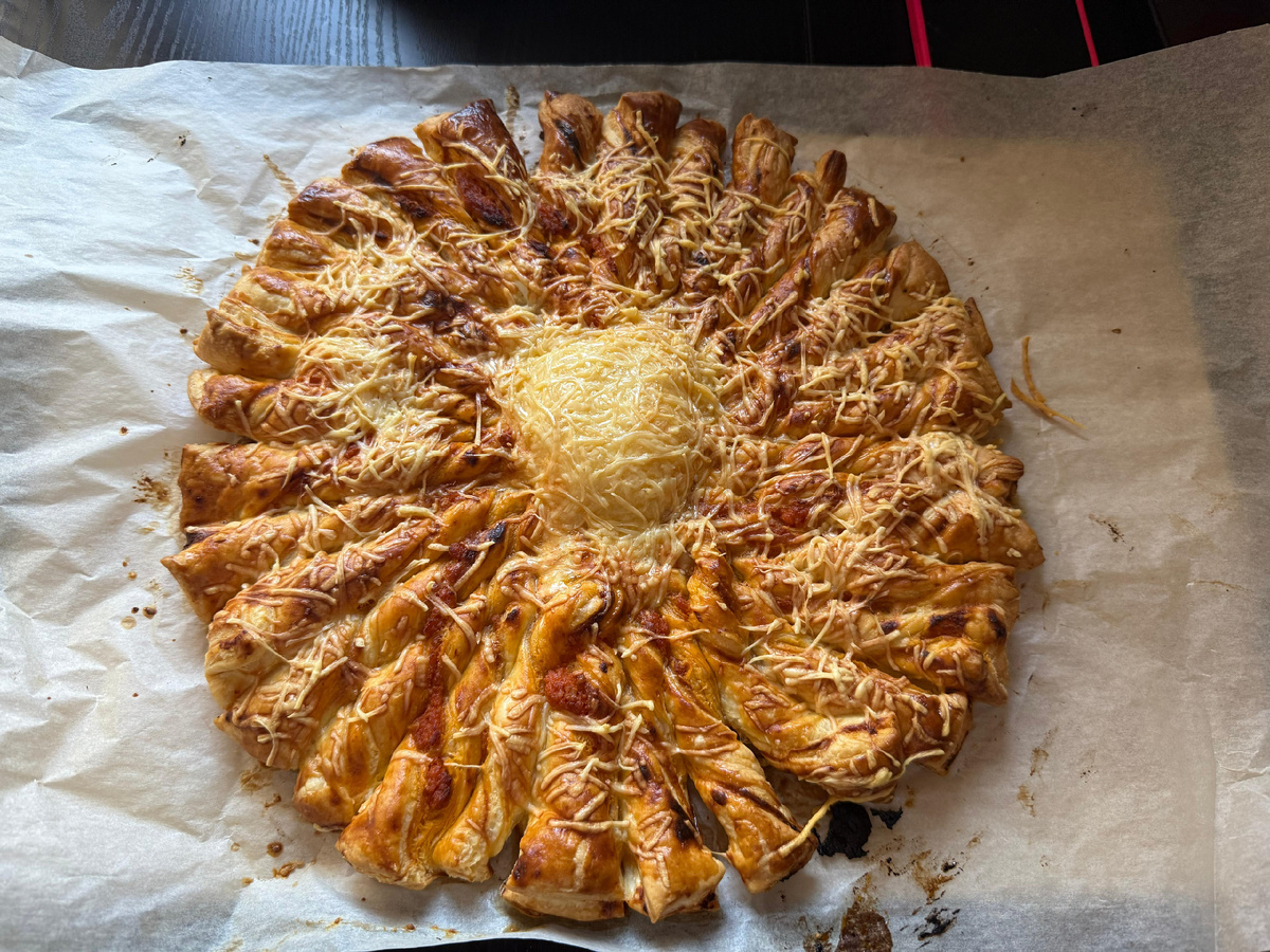 Это слоеное тесто, между двумя слоями находится паста песто и тертый сыр, слои нарезаны треугольничками и скручены как на картине, повер сыпется сыр и в духовку!