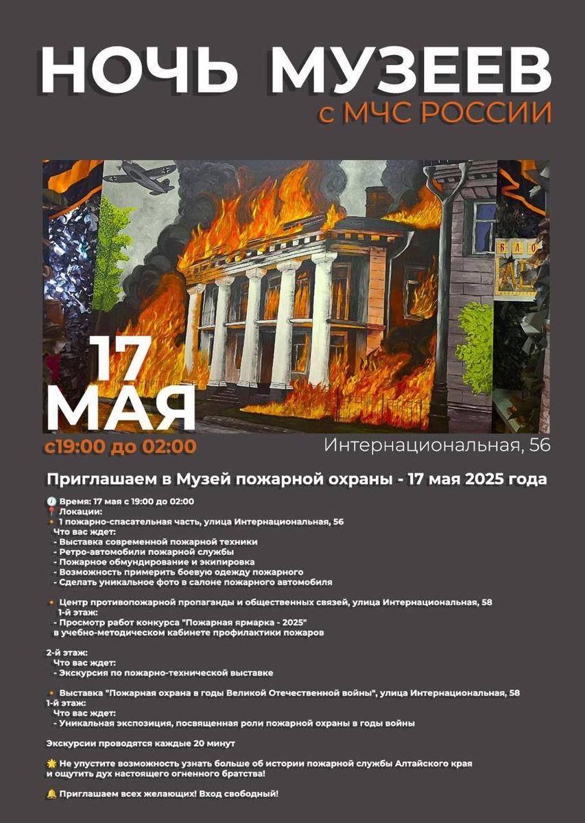 Всего несколько часов осталось до открытия Ночи музеев!⚡ 🚒 Вновь приглашаем посетить наши экспозиции. История оживёт на ваших глазах, а настоящее станет ближе. 🔥Уникальные экспонаты, примеры мужества, развитие техники и снаряжения, встреча с настоящими пожарными - всё это ждёт вас. Такое нельзя пропустить! @mchs_altkray