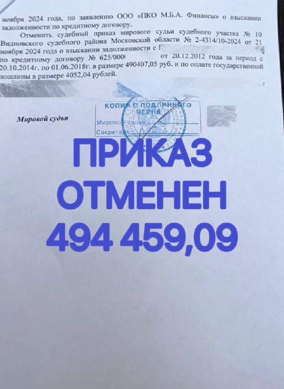 История об отмене судебного приказа на 500 000 рублей по "долгу" 2012 года Однажды утром в почтовом ящике лежал "подарочек" — заказное письмо из суда ✉️. Внутри — судебный приказ почти на полмиллиона рублей 💸. Основание? Некий "долг" от 2012 года 🕰️. 12 лет никто не писал, не звонил, не вспоминал — а тут вдруг срочно должен почти 500 тысяч. Приятно, конечно, что не забыли… но хотелось бы при других обстоятельствах 🤦♀️- с таким запросом к нам обратилась Ангелина. Впрочем, паниковать рано. Судебный приказ — это не приговор ⚖️ Он выносится в одностороннем порядке, без вызова сторон. И у получателя есть законное право: не согласен — пиши обоснованное возражение, и приказ отменят ✍️❌ Что было сделано: 1️⃣Подготовлено заявление об отмене судебного приказа 📝 2️⃣Отправка в суд ⚠️ 3️⃣Суд отменил приказ ✅ Без заседаний, без допросов, просто — определение об отмене. Взыскание остановлено.✋ Итог: судебный приказ на почти 500 000 рублей по "долгу" 2012 года успешно отменён 🛑 Ни с