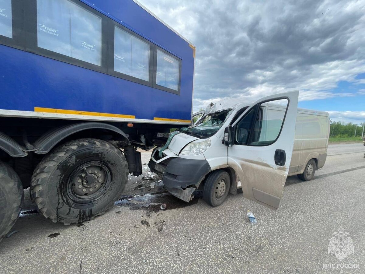 В Бугурусланском районе на трассе Р-246 Бугульма-Уральск столкнулись два грузовика. Пассажирка с травмами доставлена в больницу. Спасатели исключили возгорание, отключив аккумуляторы.