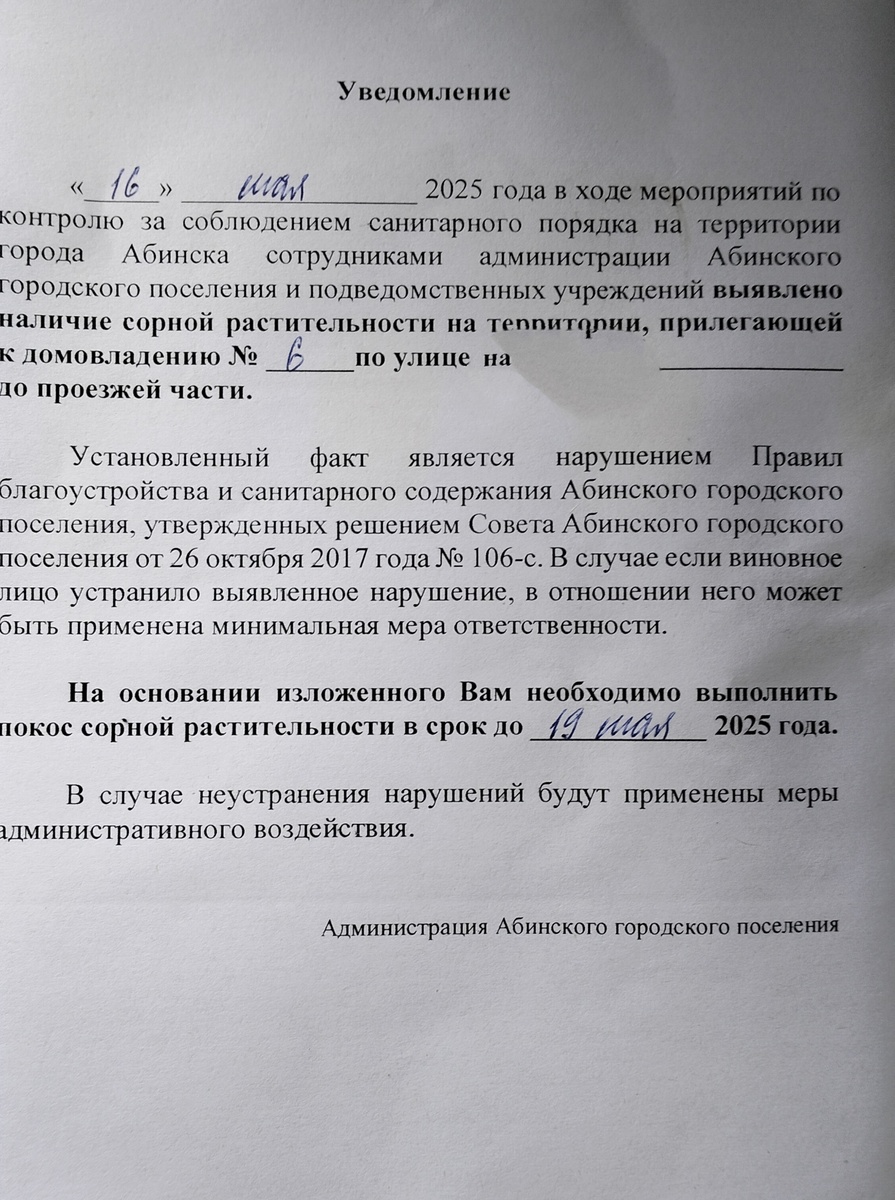 Сегодня жалуюсь... Вчера по возвращению с работы мне знатно подпортили настроение. Дело было как. Подхожу я значит к калитке и вижу в почтовом ящике это: К моменту моего прибытия домой в четыре часа трава за забором была уже сыном покошена, то есть эту бумажку товарищи кинули утром или в обед скорее всего. Вот то-то и обидно, не успели совсем чуть-чуть. У нас там за забором прилично места, разворачиваются все машины возле нас. Три недели назад косили, трава выросла опять. Там у нас растёт большой куст жасмина, но он пока не цветёт. А ведь я сыну уже неделю говорила- покоси за забором, трава опять выросла после дождя. Он мне- потом, потом, завтра. На неделе покосил немного во дворе. Я говорю, зачем во дворе, когда я сказала, сначала за забором. Тем более старший сын на те выходные приезжал, во дворе косил. Ну вот не хотят за забором косить, как-будто это стыдно, если их кто-то увидит. А что стыдного то в этом - помогать родителям? Благо косят не ручной косой, в прошлом году приобрели т