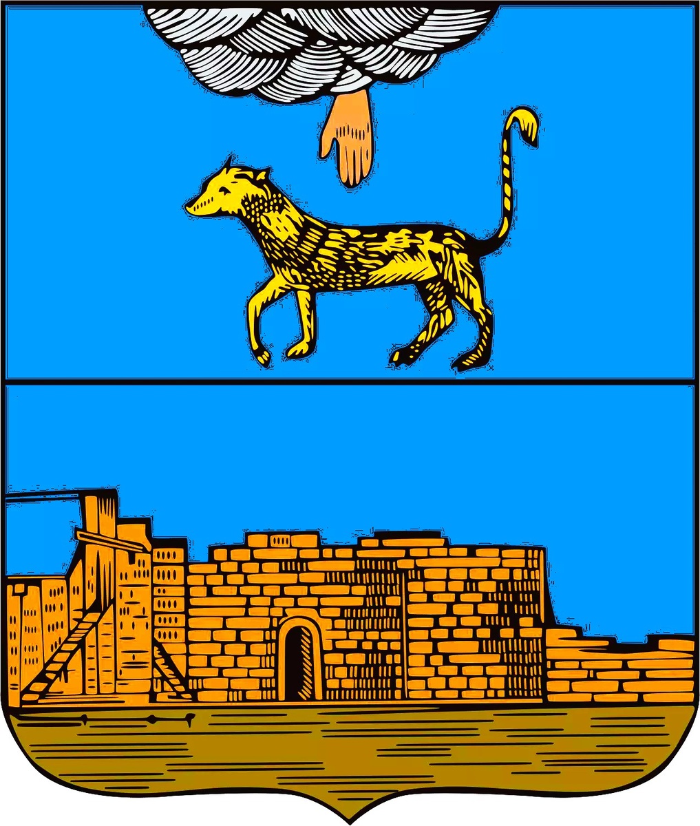 - "В верхней части щита герб Псковский, в нижней - в голубом поле древний, многопретерпевший от осад замок, начинающий возобновляться, как по истории значится. Высочайше пожалован 28 мая 1781 года"