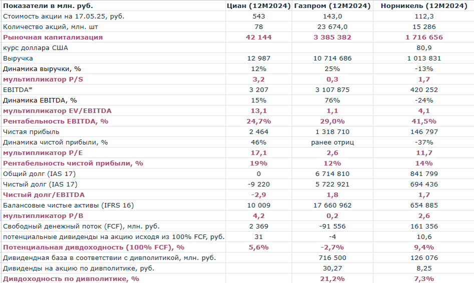 По удивительному совпадению сразу три эмитента, которые ранее не распределяли прибыль, могут преподнести дивидендные сюрпризы. Так, на следующей недели ожидаются советы директоров по вопросу выплаты дивидендов: Циан после переезда в Россию обещает заплатить спецдивиденд, то есть, распределить прибыль разом за несколько лет. Его сумма пока не известна. Исторически дивиденды не выплачивались, так как, ранее на Московской бирже обращались депозитарные расписки CIAN. Совет директоров Циана соберется по этому вопросу 20 мая. На 31.12.2024 у компании имелось 9 220 млн. руб. денежных средств. Теоретически CNRU может распределить не менее 7 000 млн. руб. или 90 рублей на акцию (ДД 16,5%). После выплаты спецдивиденда дивидендная доходность снизится до 5,6% от текущей цены CNRU. Так как, дивполитика Циана достаточно размытая - 60-100% от скорректированной чистой прибыли, то мы за дивидендную базу брали 100% свободного денежного потока. По-видимому, на него менеджмент и ориентируется. Газпром не