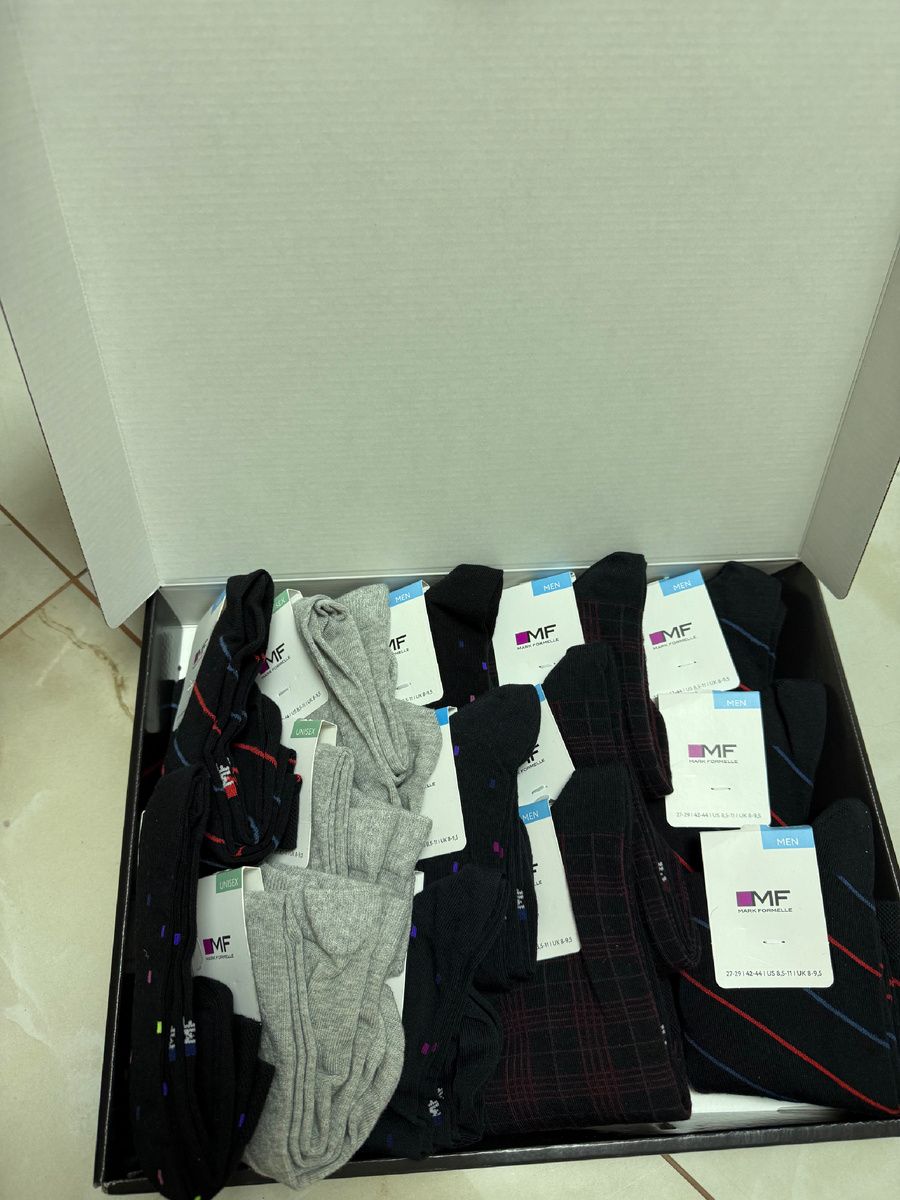 Да-да! именно так! Во время своей поездки в Минск я купила чемодан носков! В Беларуси есть бенд, который изготавливает трикотажные изделия. НЕ пестрые халаты и ползунки, которые сделали имидж белорусской трикотажной промышленности в конце 80-х, а современные качественные вещи! Спортивные костюмы, майки, белье, носки для всей семьи! Это Марк Формель. Я уже покупала вещи этого бренда - студентам и родителям по спортивному костюму, себе - пижаму. А сейчас, после глобального расхламления студенческих носков, я решила пополнить их запасы. Носков в магазине огромный выбор! Классические, прикольные, сдержанные, простые и сложные, подешевле и подороже! Я взяза изначально 12 пар, но продавец сказала, что если взять 16 - будет скидка и бонусом упакуют в подарочную коробку. Носков много не бывает! Я добавила еще 4 пары и получился отличный подарок! Прикольная упаковка и полезное содержимое! Можно взять на вооружение как презент на традиционный мужской праздник! Теперь вопрос со студенческими