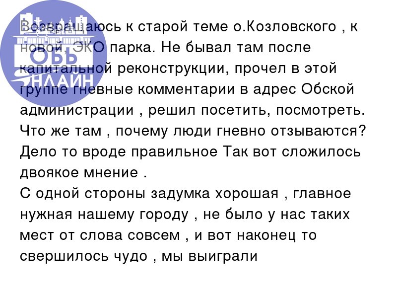 ↗ Возвращаюсь к старой теме о.Козловского , к новой, ЭКО парка. Не бывал там после капитальной реконструкции, прочел в этой группе гневные комментарии в адрес Обской администрации , решил посетить, посмотреть. Что же там , почему люди гневно отзываются? Дело то вроде правильное Так вот сложилось двоякое мнение . С одной стороны задумка хорошая , главное нужная нашему городу , не было у нас таких мест от слова совсем , и вот наконец то свершилось чудо , мы выиграли финансирование национального проекта комфортная городская среда .(поправьте меня если ошибаюсь в формулировках) Вернусь к сути начав с того что сразу меня возмутило то что со стороны 28 дома нет подхода сплошная грязина , козьи тропы , местами недоделанные , либо уже разломанные конструкции , парк не облагорожен до логического своего завершения . Но самое главное у меня возникли вопросы : -Кто готовил проект? -Почему использовались самые дешёвые, недолговечные материалы ? Например железные трубы…