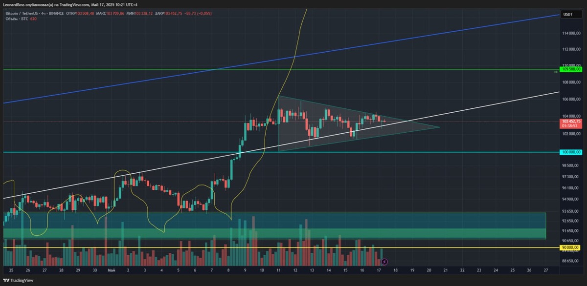 ⚠️Как видим, по битку практически никаких изменений не произошло. Всё тот же локальный боковик, над той же локальной трендовой, которая уже дважды удержала цену. В результате коротких импульсов в обе стороны, образовался небольшой локальный треугольник консолидации, который лежит в плоскости трендовой, от чего импульс выхода из текущего диапазона обещает быть достаточно сильным!!