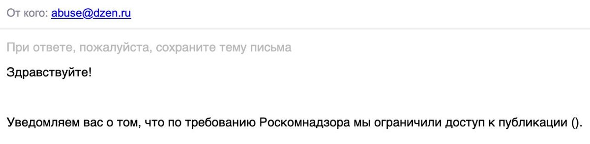 Не думал что такое возможно, но таких ограничений будет больше и больше. Причем ограничили новость которая просто является новостью о самоубийце. Странно конечно. Для тех кто не в курсе, на Дзене я тоже есть, туда форвардом идут сообщения с канала. https://dzen.ru/real_phuket