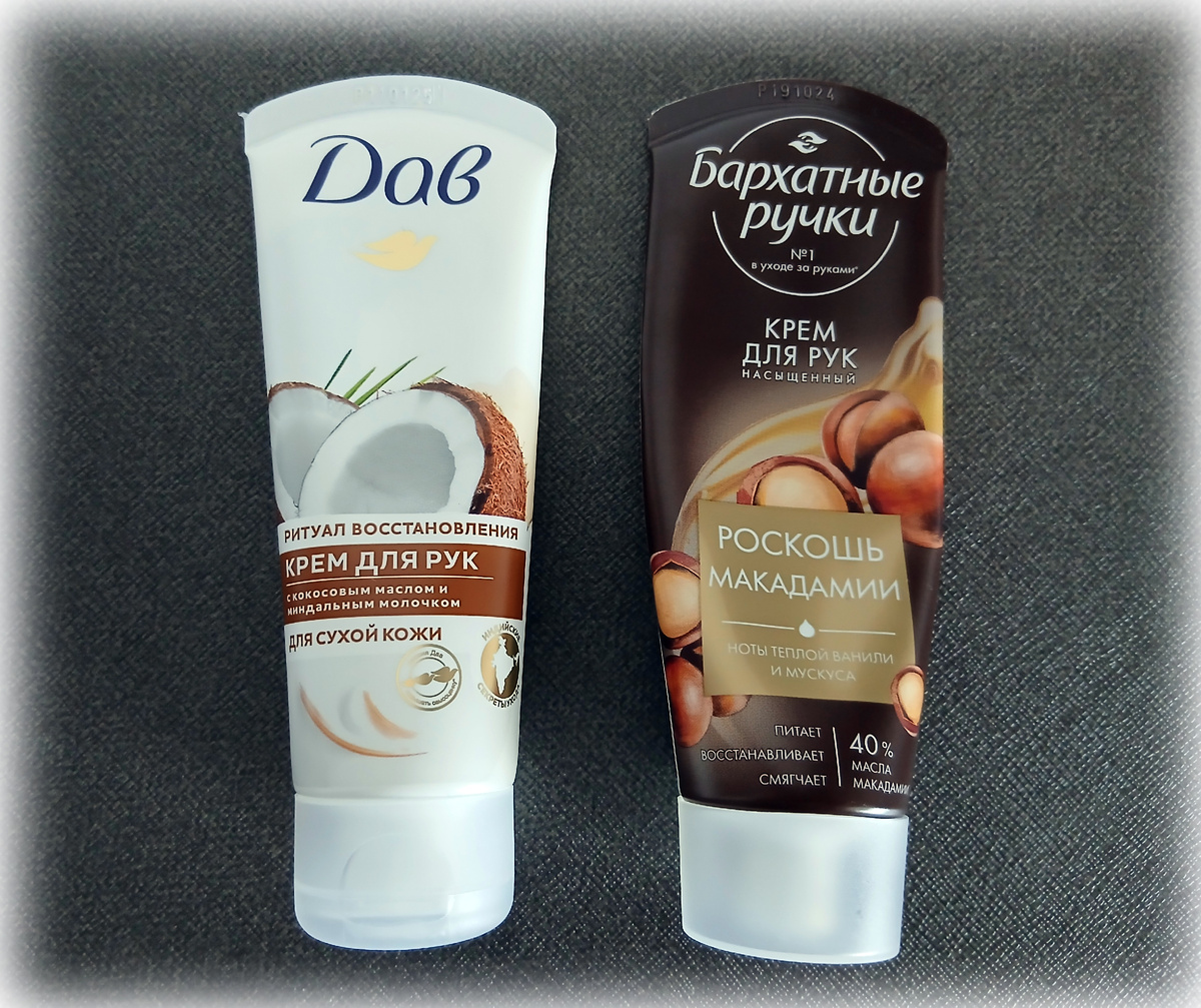 Всем привет! 👋 Стараюсь показывать, что у меня появляется из косметического ухода, и оставляю свой отзыв. Возможно, для кого-то информация окажется полезной. Дав "Ритуал восстановления", с кокосовым маслом и миндальным молочком, для сухой кожи, 75 мл, цена: 136 руб. на Ozon. Крем очень нежный, лёгкий, консистенция не густая и не жирная. Быстро впитывается и хорошо увлажняет, не оставляет ощущения липкости. Приятный аромат кокоса и миндаля. Мне очень нравится. Бархатные ручки "Роскошь макадамии", ноты тёплой ванили и мускуса, насыщенный, 80 мл, цена: 115 руб. на Ozon. Этот крем более густой и жирный. Впитывается дольше, но липкости также не оставляет. Аромат сильный и яркий. В целом, крем хороший, но по ощущениям Дав мне нравится больше. BioMio мыло для тела кремовое "Лаванда-жасмин", 140 гр, цена: 129 руб. В составе: эфирное масло лаванды, экстракт алоэ вера и бетаин, масло ши. Про жасмин в описании ничего нет 🤷♀️. Просто мыло. По ощущениям - даже не кремовое. Внушительный брусочек,