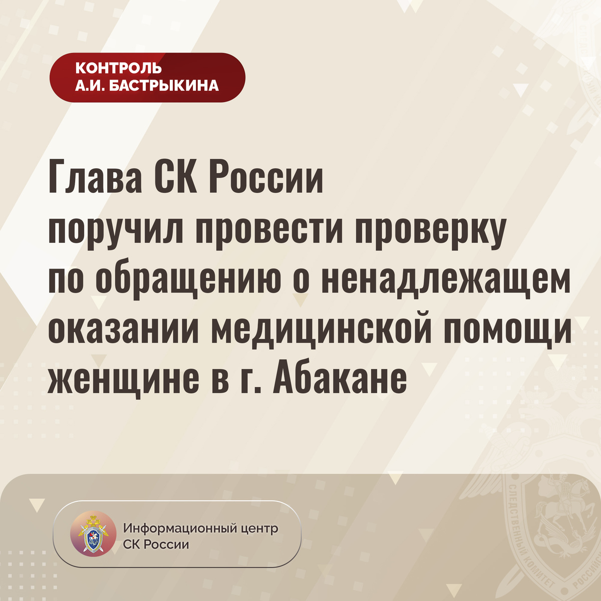 Глава СК России поручил провести проверку по обращению о ненадлежащем оказании медицинской помощи женщине в г. Абакане