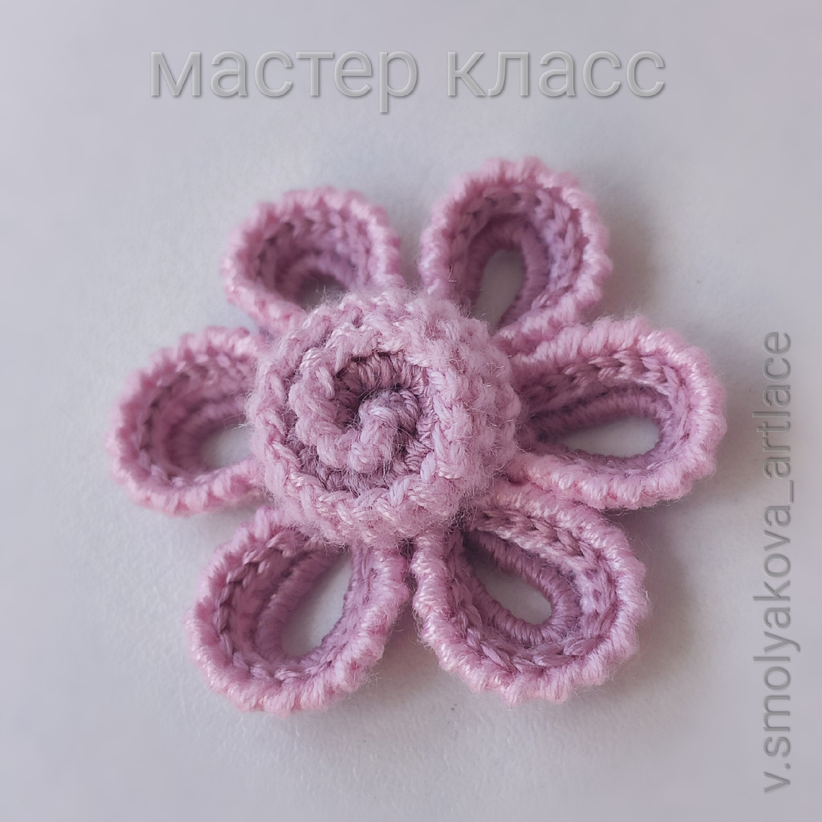 Пример связан из двух близких оттенков натурального шёлка. Шаг 1. Основа серединки цветка шнур гусеничка Для этого цветочка она тоненькая, шириной 2 мм, поэтому серединка получается миниатюрной, около 1 см. Вяжем шнур гусеничку длиной в 45 боковых петельки Шаг 2. Готовый шнур обвязываем зигзагом, листните галерею Шаг 3. Красиво и аккуратно закручиваем шнур Шаг 4. Каждый лепесток вяжем сразу два ряда , чтобы избежать лишнего утолщения между лепестками. Обвязываем лепесток второй нитью компаньоном. На примере, светлой. Один лепесток сразу же обвяжем двумя рядами. Шаг 5. Первый ряд обвязываем укороченными столбиками без накида Шаг 6. Второй ряд - обвязка рачьим шагом Шаг 7. Прокладываем цепочку между обвязкой рачий шаг и дугой укороченных столбиков, придавая форму лепесткам. Результат: Мини композиция Нежность Благодарю за внимание! Если материал полезен оставьте лайк, это послужит стимулом для создания новых статей. Также можете посмотреть какие есть полные курсы по созданию кружева в