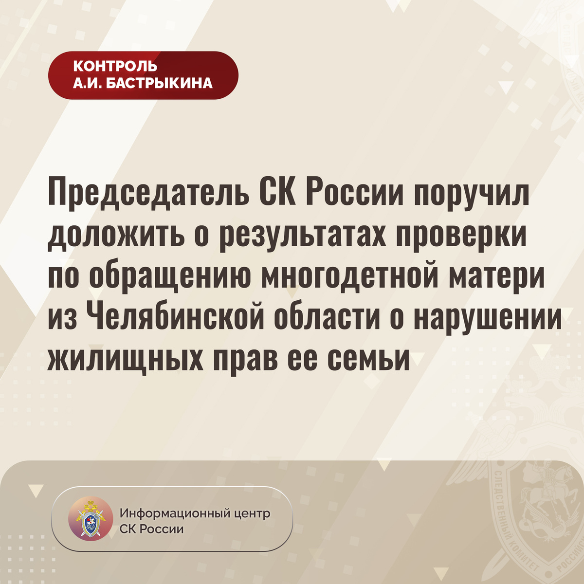 Председатель СК России поручил доложить о результатах проверки по обращению многодетной матери из Челябинской области о нарушении жилищных прав ее семьи