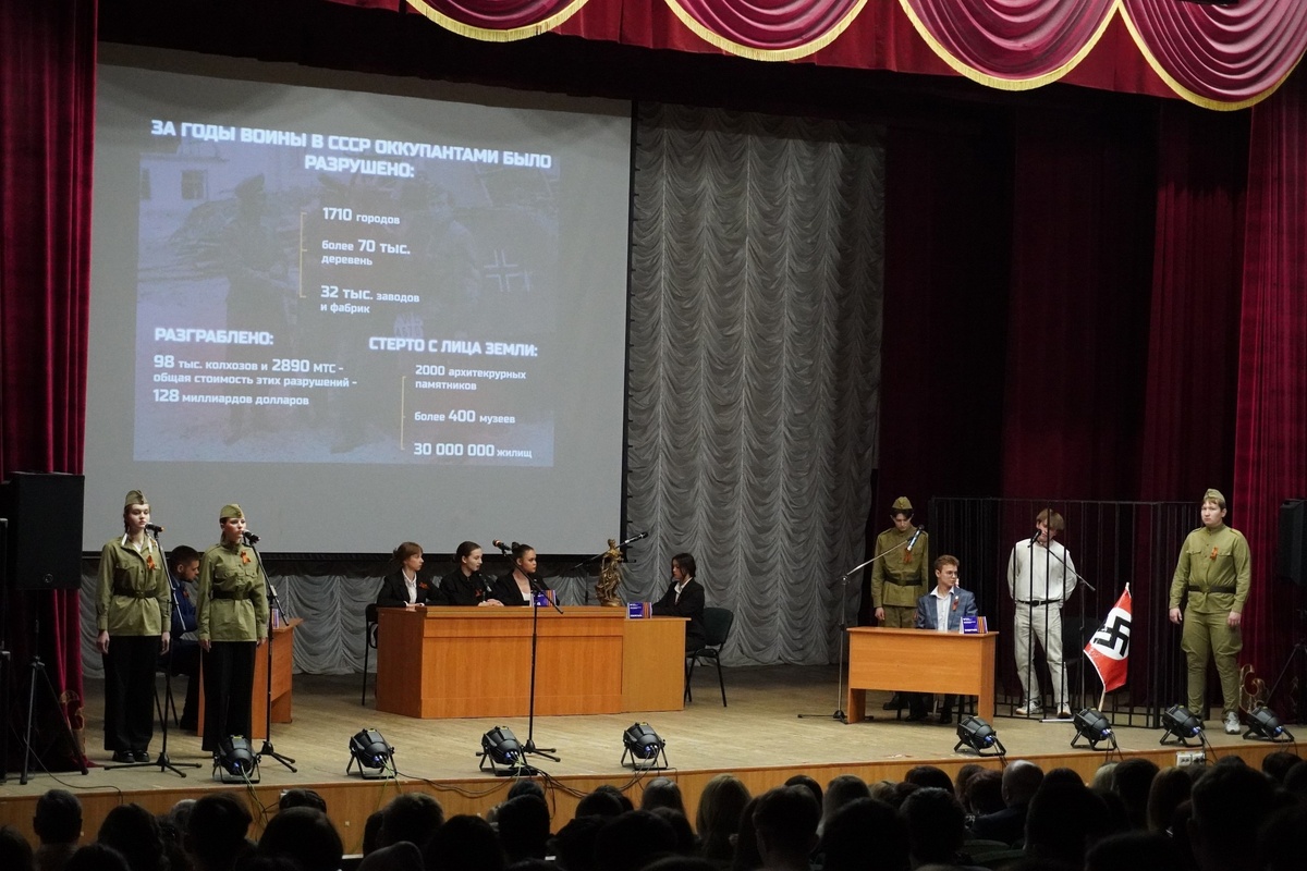 В актовом зале Стерлитамакского филиала Уфимского университета науки и технологий состоялось театрализованное представление «Суд над фашизмом», которое подготовили студенты колледжа совместно со своими педагогами. В актовом зале Стерлитамакского филиала Уфимского университета науки и технологий состоялось театрализованное представление «Суд над фашизмом», которое подготовили студенты колледжа совместно со своими педагогами. Рядом с актовым залом развернули работу музей «Вооружение армии России» и выставка беспилотных летательных аппаратов. На сцене был представлен импровизированный суд. На скамье подсудимых - фашизм, который обвиняется в многочисленных жертвах Второй мировой войны. Юные артисты напомнили о кровавых трагедиях и героизме людей, прошедших суровые испытания. О том, как важно помнить уроки истории, чтобы не допустить повторения страшных событий.