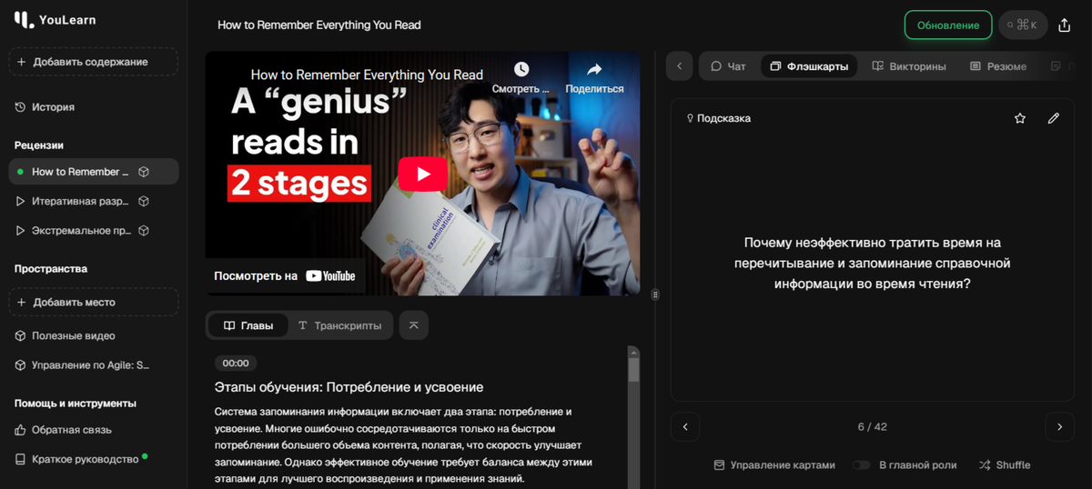 Революционная находка! Можете сразу сохранить пост, а после прочитать обзор. Совсем недавно миру был представлен ИИ-репетитор с шикарным набором функций. Я уже протестировала новинку и спешу поделиться впечатлениями с вами. Знакомьтесь, YouLean – ИИ-репетитор, призванный облегчить процесс обучения всем тем, кто грызёт гранит науки. Что умеет: Анализ учебных материалов. Можно загружать книги, документы, видео, аудио, презентации и даже вставлять ссылки на YouTube. Программа проанализирует ваши материалы и выдаст текстовое саммари. Не замена конспектам, но хорошее подспорье, когда нужно выжать из лекций самое главное. ИИ-помощник. Ему можно задавать вопросы по загруженным материалам, а он будет дополнительно структурировать информацию, отвечать на вопросы, давать ссылки на загруженный текст или тайм-коды на видео. В общем будет тем учителем, к которому можно прийти с любым вопросом, и он не развернет вас со словами "вас 30 человек, а я один". Флэш-карты. Классная фишка для дополнительно