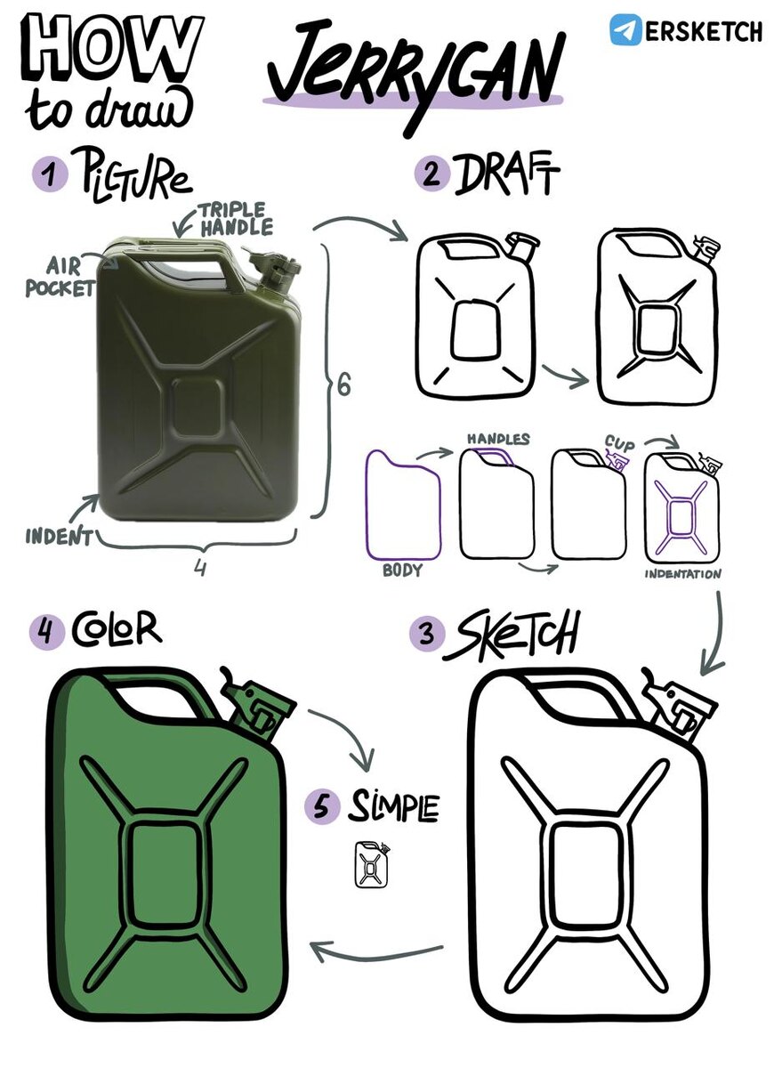 #HowToDraw #WSC2025 №20 Прежде чем начнем рисовать канистру, надо про нее немного рассказать, потому что штука эта весьма интересная. Дело в том, что в ней есть много крутых дизайнерских решений. Во-первых, у канистры три ручки, поэтому ее можно тащить вдвоем за крайние ручки или одному за среднюю, в зависимости от того, насколько она тяжелая. Далее, у нее есть специальный воздушный карман, который находится выше горловины, поэтому если ее залить до краев, а потом уронить в воду, то она всплывет. Для жесткости у нее есть специальные углубления на боковых стенках. Они также помогают канистре не порваться при нагревании и остывании. Горлышко тоже довольно хитро устроено. Во-первых, в него встроена крышка. Во-вторых, на картинке этого не видно, но в горлышке есть специальная трубочка. Одним концом она торчит из горлышка, а другим заходит в воздушный карман. Благодаря этому, когда из канистры начинаешь лить что-то, она не булькает, жидкость течет ровным потоком. Теперь начнем рисоват