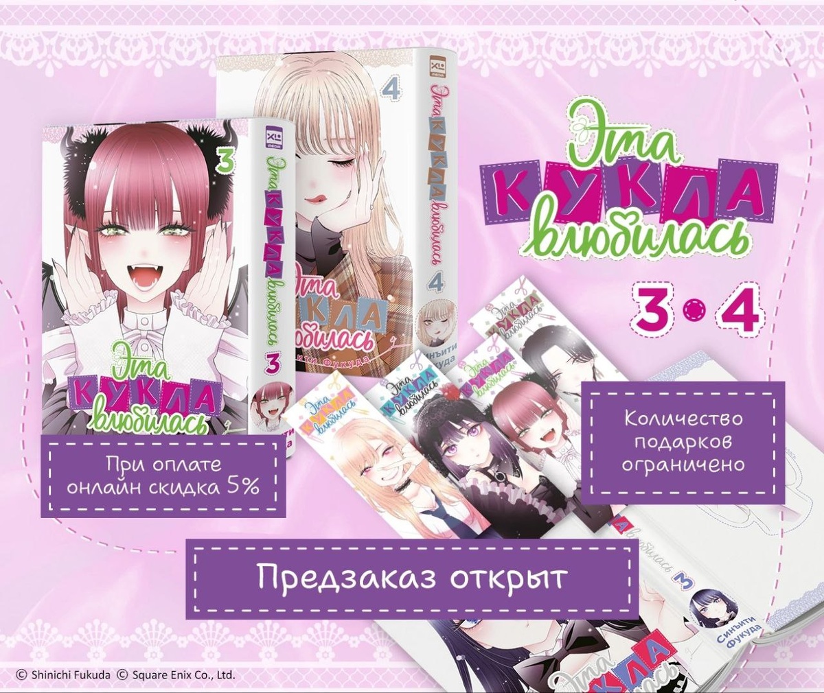 💌 Дорогие друзья, у нас сегодня столько новостей, что сердце замирает! Знаете, как иногда хочется, чтобы любимая манга выходила быстрее? Мы отлично вас понимаем! И вот мы торжественно объявляем: предзаказ на 3 и 4 тома «Эта кукла влюбилась» открыт! А ещё мы приготовили сюрпризы: ✂ Первые 2000 заказов получат милейший набор закладок. +5% скидка тем, кто оплатит заказ онлайн — просто чтобы сказать вам «спасибо» за доверие. Ах, эти новые тома… Том 3 — про ревность, которая превращает куклу в ураган эмоций, а том 4 — про тайны, что могут разрушить всё, что ей дорого. И да, тем, кто ждёт 1 и 2 тома — отличные новости! Ваши книги уже на подходе и приедут в середине лета. Оставайтесь с нами и следите за новостями сообщества! Изд. XL Media Серия: 14 томов. Онгоинг. #манга #ранобэ