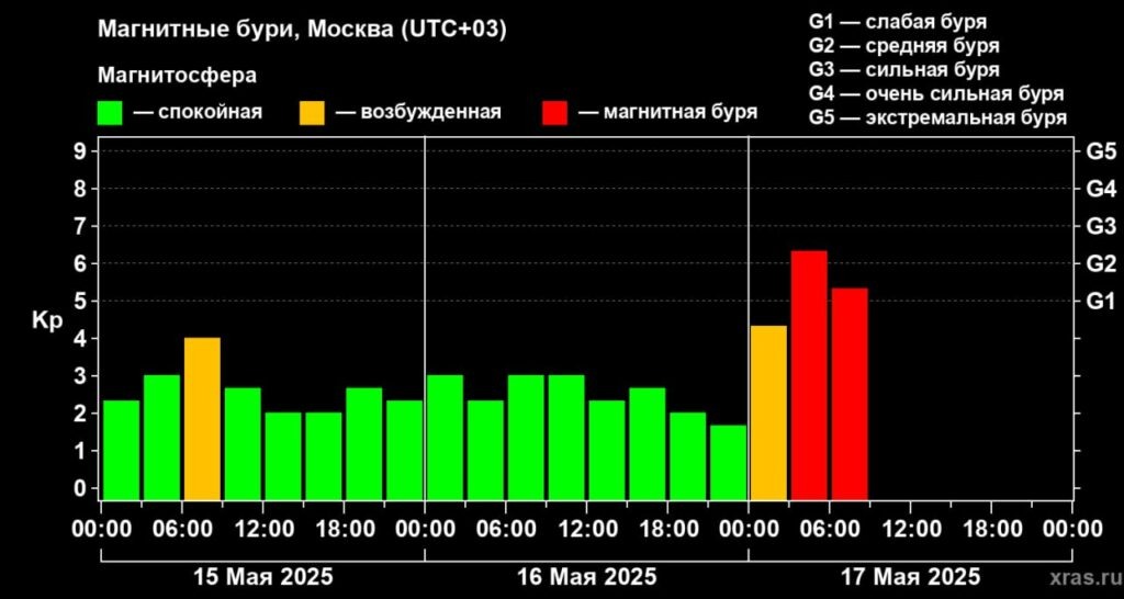 Согласно данным геофизических наблюдений, магнитная буря, разразившаяся в ночь на 17 мая, к утру потеряла силу. После шести часов утра геомагнитное поле начало постепенно успокаиваться. Сейчас активность оценивается специалистами как слабая и соответствует уровню G1.