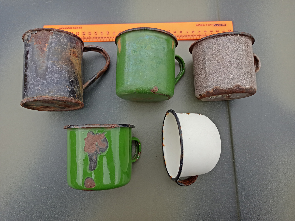 Верхний ряд кружка штатная РККА, нижний ряд для сравнения бытовые гражданские кружки. Главное отличие в форме ручки, у военной кружки она напоминает половину изображения сердца. Делалось это специально, чтобы кружка не прыгала при движении в такт на марше, когда её прикрепляли к рюкзаку или вещмешку. Массовое производство эмалированной посуды стадо возможным только при советской власти, когда нашли дешёвую технологию производства силикатной эмали. Ещё одна отличительная особенность военных кружек - это окраска в светлые тона внутренней стороны кружки. Делалось это для лучшей возможности проверять качество насыпного сухого довольствия, а заодно и его количество, для чего внутри делали отметки. Появление в войсках эмалированных кружек стало большим достижением для улучшения бытовых условий для обычного солдата, потому как раньше пили из манерок от фляг и других подручных ёмкостей. На дне ставилась маркировка предприятия изготовителя, с клеймом предприятия и информацией о размере и дате