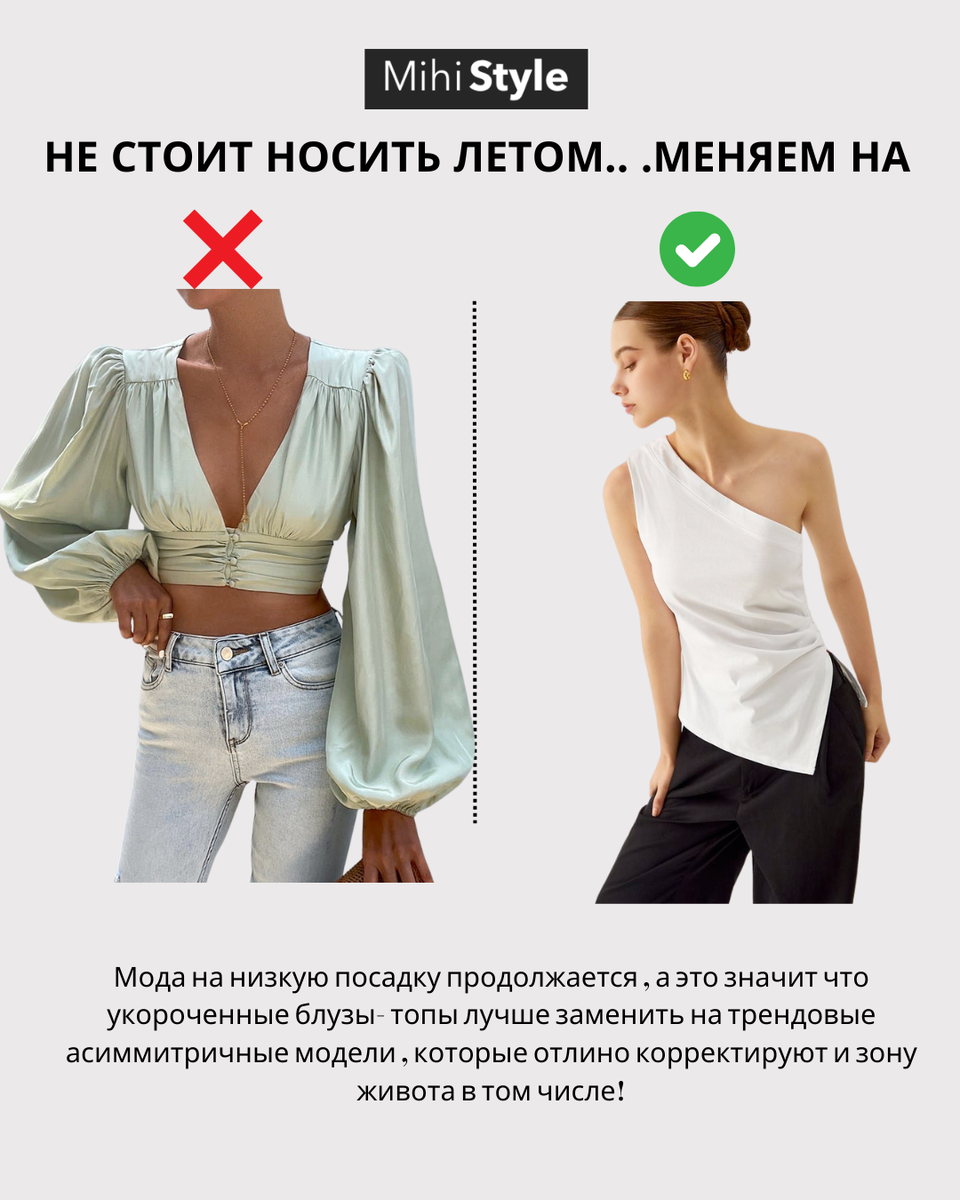 Летний сезон 2025 года приносит с собой свежие модные решения, которые помогут вам выглядеть стильно и чувствовать себя комфортно. Давайте детально разберём каждую рекомендацию из представленных изображений, чтобы вы могли грамотно обновить свой гардероб. Мода на низкую посадку уступает место более элегантным решениям. Вместо коротких обтягивающих топов выбирайте асимметричные модели, которые не только выглядят современно, но и помогают скорректировать силуэт. Такие блузы с неровным подолом визуально стройнят и делают образ более интересным. Широкие платья-трапеции остаются в прошлом. В тренде женственные приталенные модели с пышной юбкой - они прекрасно подчеркивают талию и создают романтичный силуэт. Выбирайте как мини, так и макси-длину - главное, чтобы был четкий акцент на талии. Классические прямые модели платьев-рубашек с коротким рукавом теперь выглядят слишком просто. Обратите внимание на приталенные варианты с запахом или поясом - они создают более женственный силуэт.