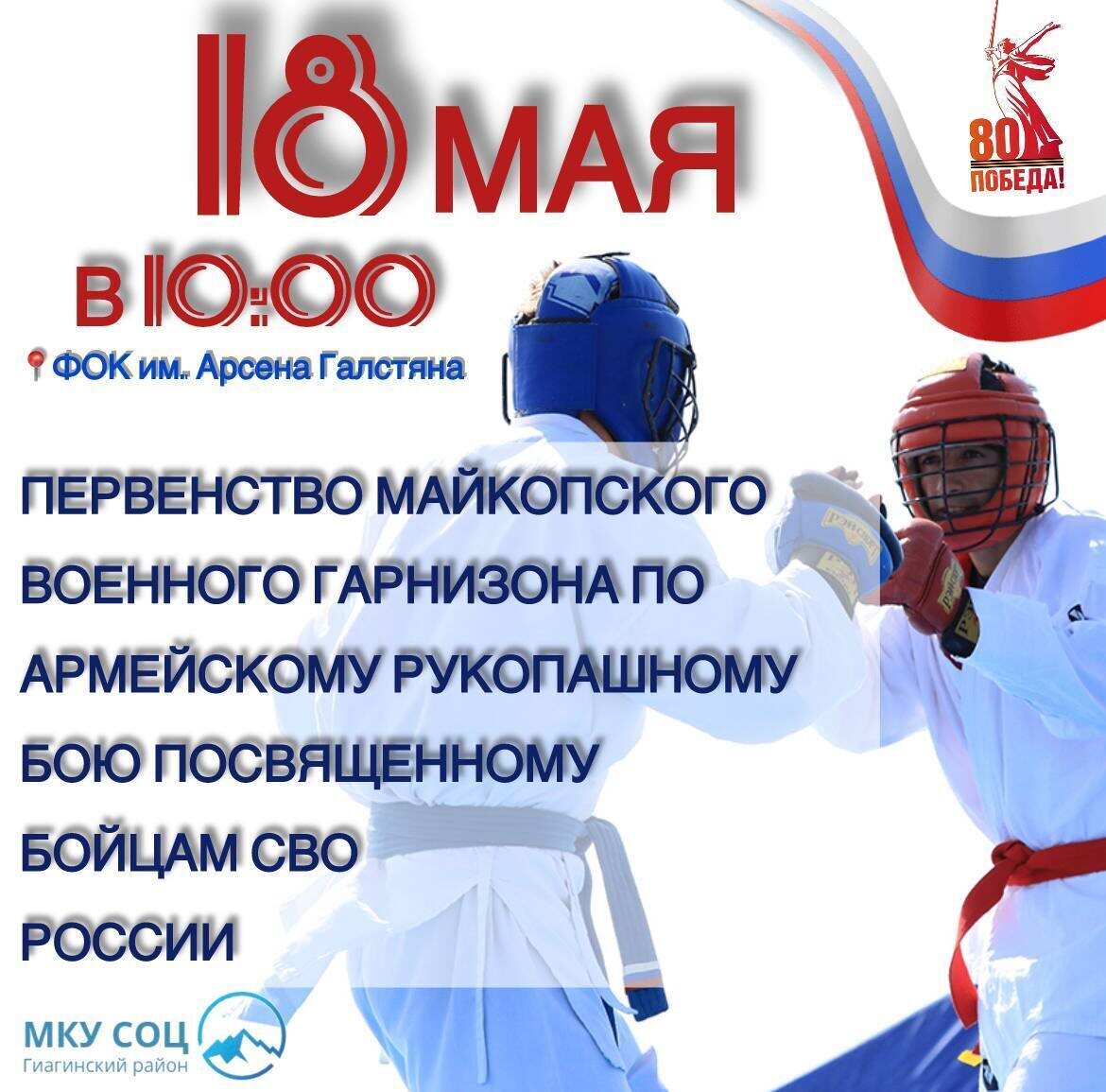 18 мая в 10:00 в Спортивно-оздоровительном комплексе им. Арсена Галстяна пройдет первенство Майкопского военного гарнизона по армейскому рукопашному бою, посвященное бойцам СВО. Приглашаем всех жителей и гостей Гиагинского района посетить мероприятие.