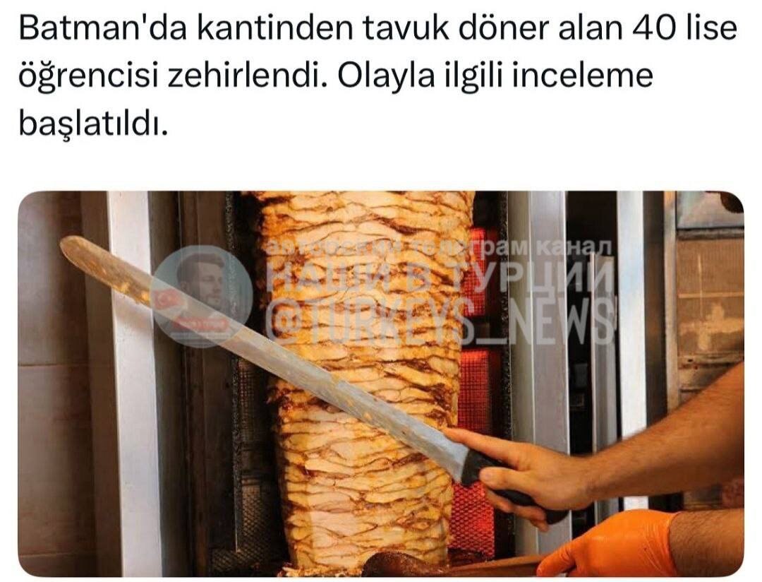 🇹🇷 В ТУРЦИИ 40 ШКОЛЬНИКОВ ОТРАВИЛИСЬ КУРИНЫМ ДОНЕРОМ В городе Батман 40 старшеклассников почувствовали недомогание после того, как купили куриный донер в кафетерии. Всех госпитализировали с симптомами пищевого отравления. По факту инцидента начато расследование. Образцы еды направлены на экспертизу, а деятельность заведения временно приостановлена. 📌 Подписывайся на TurkeyNews Следим за новостями Турции