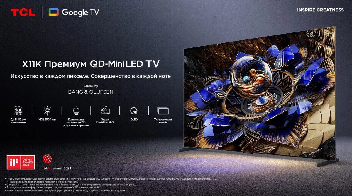 Компания TCL, один из ведущих производителей телевизоров в мире, представила две новые линейки своих решений. В частности речь идет о флагманских X11K и среднебюджетных P8K. TCL X11K выделяются высокой точностью регулировки яркости, пиковой яркостью 6500 нит, экраном CrystGlow HVA и Audio by Bang & Olufsen. Ультратонкий корпус, мощный процессор AiPQ Pro, нативная частота обновления 144 Гц и широкие интеллектуальные возможности делают серию X11K идеальным выбором для тех, кто выбирает безупречное качество изображения, звука и современный функционал. Телевизоры TCL серии X11K оснащены передовой технологией QD-Mini LED, которая сочетает преимущества QLED и Mini LED для достижения исключительной яркости, глубокой контрастности и широкой цветовой гаммы. Благодаря высокой точности регулировки подсветки — до 14 112 зон локального затемнения — модели X11K демонстрируют потрясающую детализацию как в ярких, так и в тёмных сценах. Пиковая яркость 6500 нит и сверхвысокая контрастность обеспечивают
